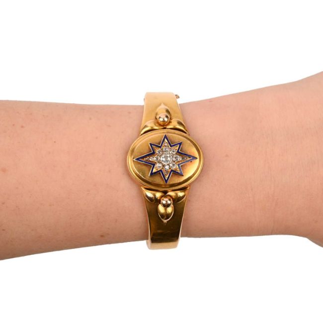 A VICTORIAN DIAMOND-SET GOLD BANGLE, centring on a diamond cluster within blue enamel star border and foliate borders in yellow gold, inner circumference 16cm, 24g