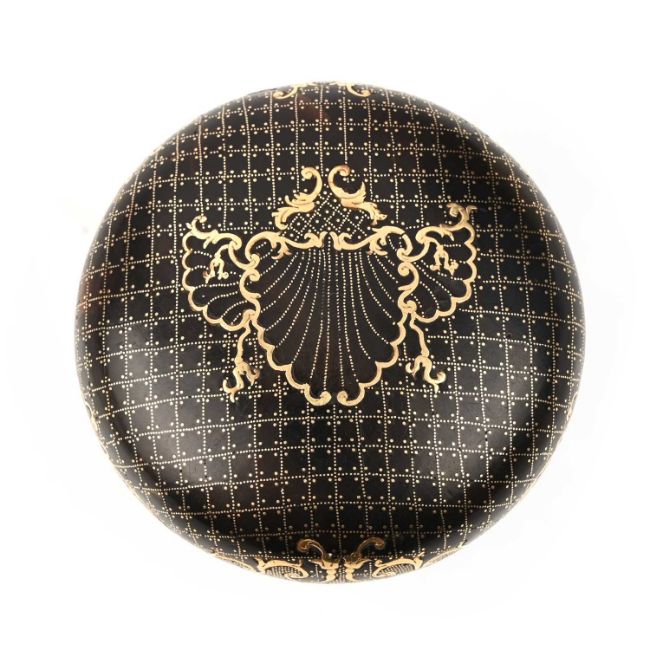 λ AN ITALIAN GOLD-MOUNTED TORTOISESHELL AND GOLD PIQUÉ SNUFFBOX, PROBABLY NAPLES, CIRCA 1750, decorated with gold piqué, rocaille scrolls and scalloped shells, approximately 6.5cm diameter