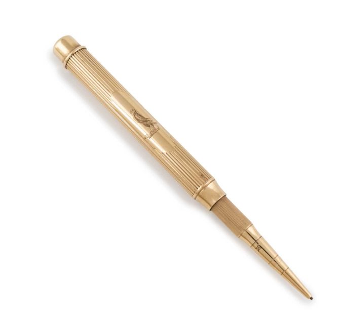 A 9-carat gold drop-action pencil, by S. Mordan and Co., London 1913, fluted cylindrical form, engraved with a crest, length 7.7cm, approx. total gross weight including the mechanism 26.3 g.Provenance: A Private Collection of Pencils and Dip Pens.