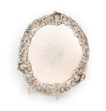 A George III silver waiter, by Daniel Smith and Robert Sharp, London 1762, circular form, the centre engraved with an armorial within foliate scroll mantling, with a cast border with trailing grapevines, and masks, on three pierced foliate bracket feet, diameter 17cm, approx. weight 12.8oz.Provenance: The Michael Baggott Collection.