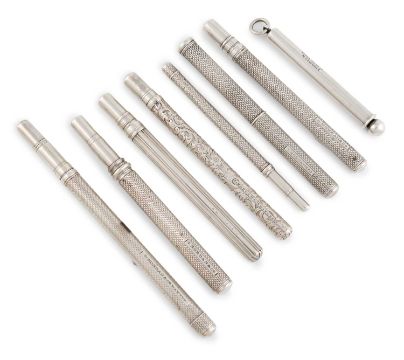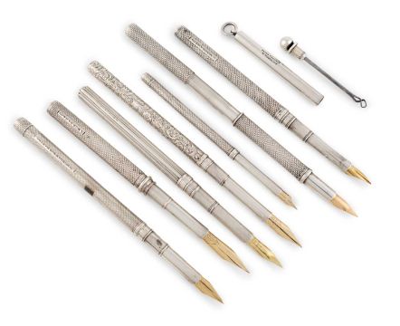 A collection of antique silver dip pens and pencils, by S. Mordan & Co, cylindrical form with engine-turned and engraved decoration, including three dip pen and pencil combinations, plus four dip pens, one with a propelling movement, with various nibs, including 'The Chicago Gold Pen Co. No.3', and 'F.T Pearce and Co.', plus a plain Mordan sheaf with a ball finial, the cover unscrews to reveal a steel corkscrew/extractor, approx. weighable 2.4oz. (8)Provenance: A Private Collection of Pencils and Dip Pens.