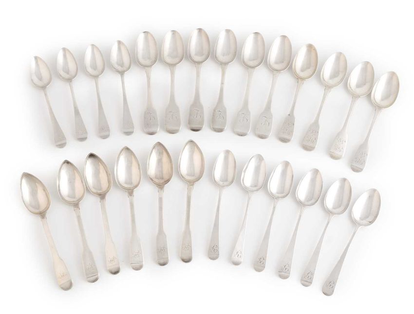 A collection of George III-William IV provincial silver teaspoons, comprising: a set of six Old English pattern, by James Barber, York 1812, a set of six Fiddle pattern teaspoons, by Barber, Cattle and North, York 1833, a set of six Fiddle pattern, by Edward Jackson, York 1821, plus two sets of four teaspoons, all the terminals initialled, approx. weight 14.5oz. (26)Provenance: The Michael Baggott Collection.
