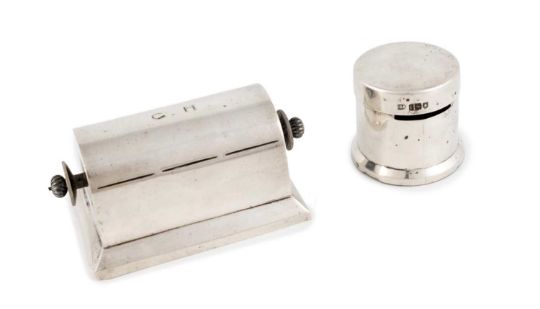 one of cylindrical form with pull-off cover and stamp slit to the side, the other is raised rectangular form with a curved top engraved with initials, with two turning knobs to the side, length 9.2cm, approx. weighable 3oz. (2)