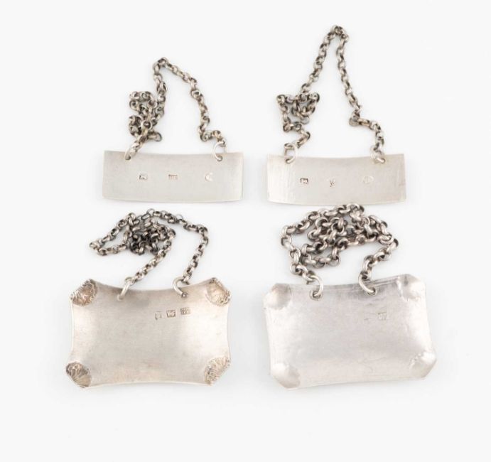A pair of George III provincial silver wine labels, by Robert Cattel, York circa 1807, rectangular form, bright-cut decoration, incised 'Sherry' and 'Port', plus one by Barber and Whitwell, York circa 1820, incised and blackened 'Rum', and one by James Barber and Co, York circa 1824, re-titled 'Gin', approx. total weight 1.1oz. (4)Provenance: The Michael Baggott Collection.