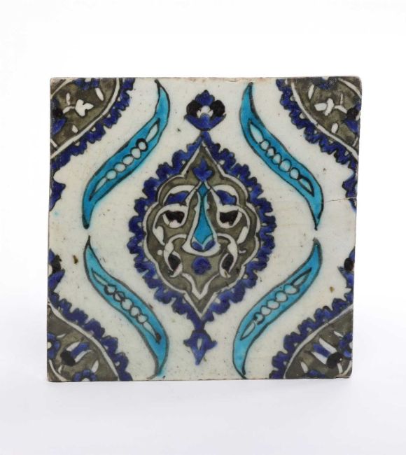 A DAMASCUS TILELATE 16TH / 17TH CENTURYof square form, painted in blue, green and turquoise with a central rosette flanked by leaves and inside stylised floral corners, on a white ground, the underside unglazed23cm square