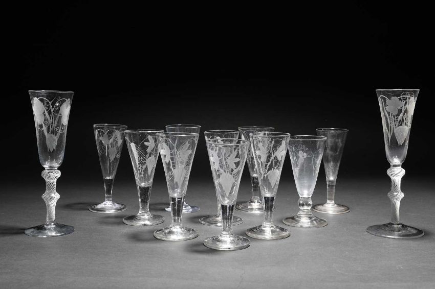A COLLECTION OF TEN ALE GLASSESMAINLY 19TH CENTURYeach with a slender funnel bowl and most engraved with hops and barley, together with a pair of ale glasses, 20th century, with knopped, airtwist stems (12)20.3cm high (max)ProvenanceThe Tony Elliott Collection
